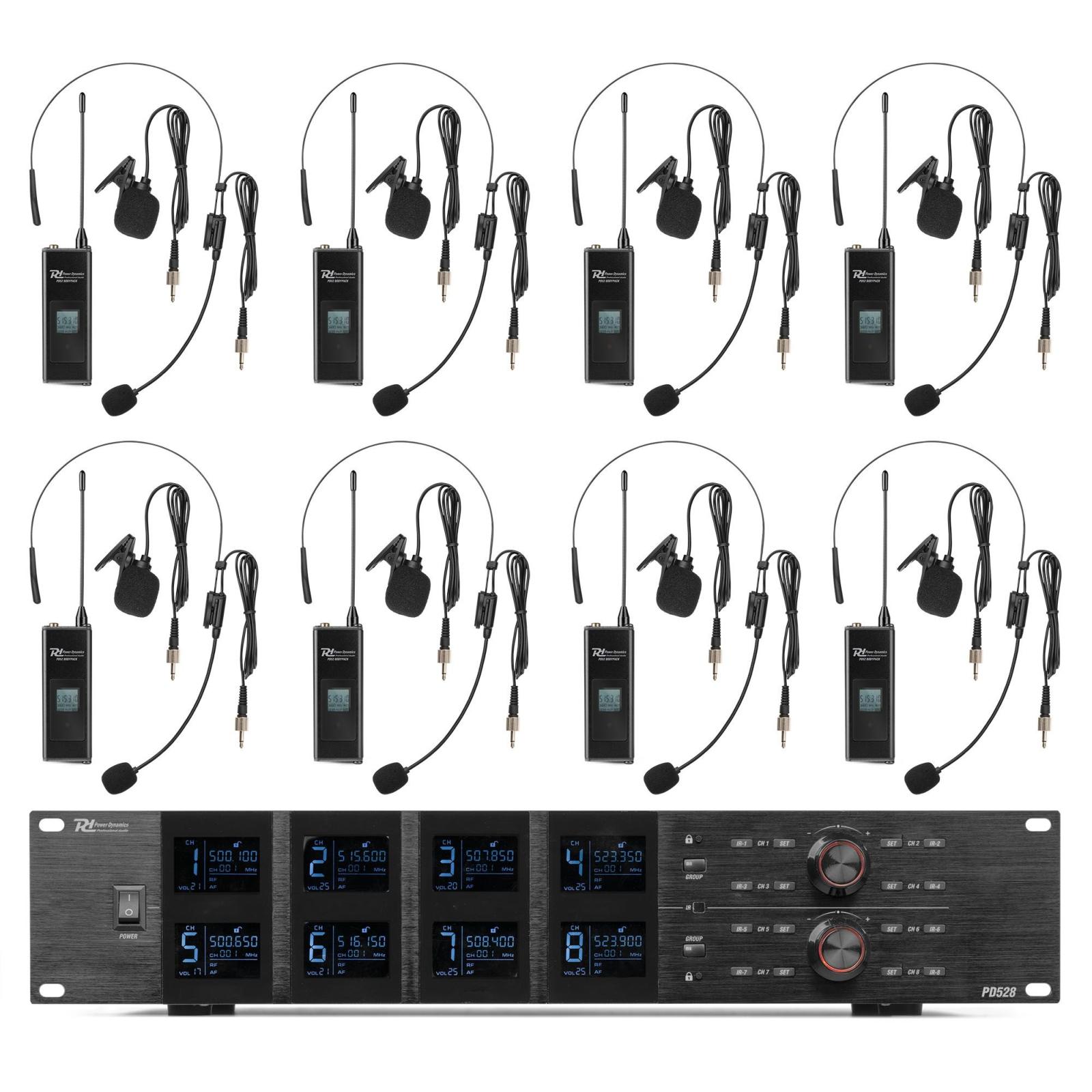Micro sans fil UHF, 8 canaux, 8 émetteurs ceinture, micro cravatte et serre-tête, 500-530 MHz