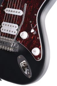 G110, corps peuplier, manche érable, touche jatoba, 3 micros Powersound (S/S/H), plaque tortoise, noir pores ouverts